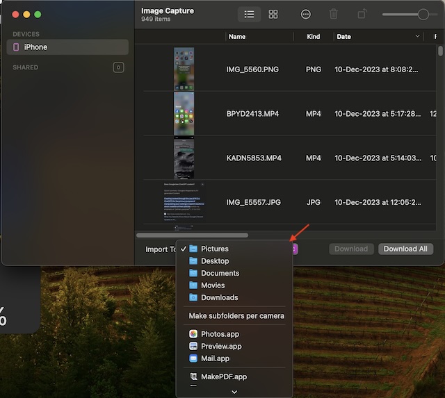 5.Αξίζει να επισημανθεί ότι μπορείτε επίσης να επιλέξετε προαιρετικά έναν συγκεκριμένο προορισμό στο Mac. Απλά χτυπήστε το"Εισαγωγή"μενού αναπτυσσόμενο μενού ή επιλέξτε το φάκελο εικόνων ως προεπιλεγμένη επιλογή.