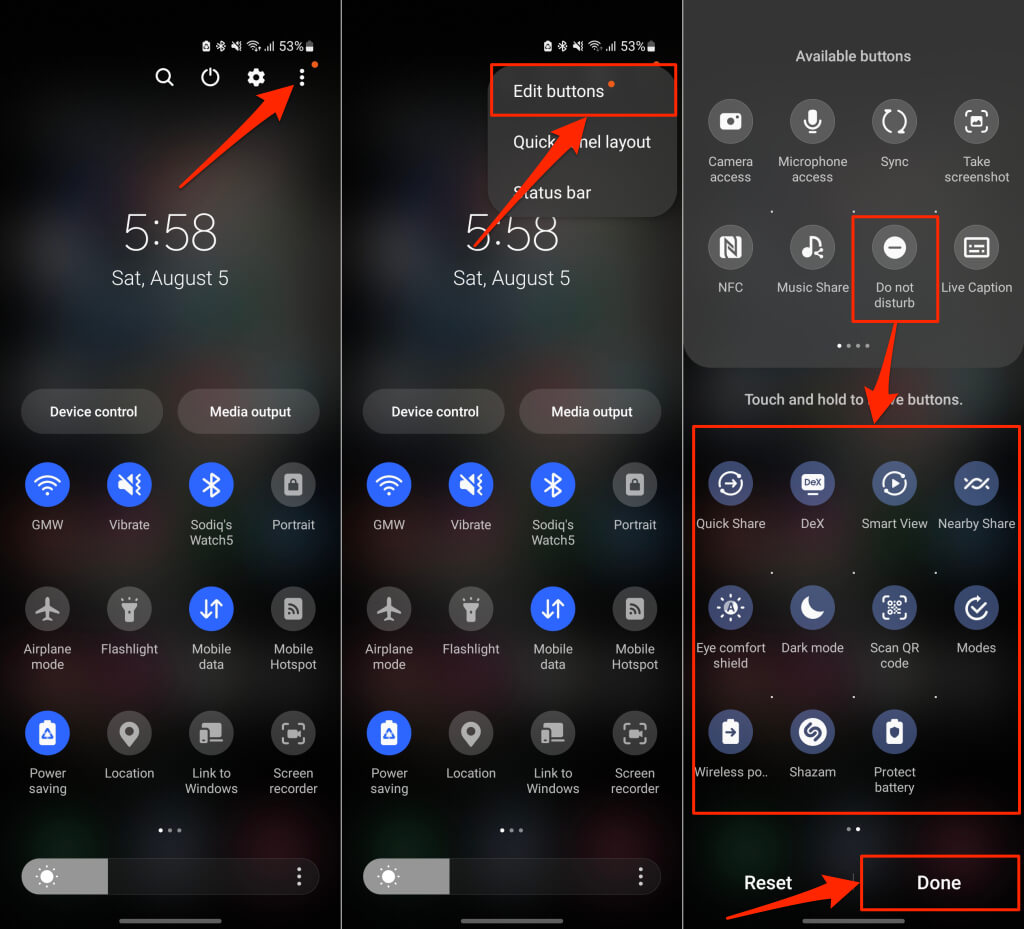 Δεν μπορείτε να βρείτε "Μην ενοχλείτε" στον πίνακα γρήγορων ρυθμίσεων; Πατήστε τοεικονίδιο μενού τριών σημείωνστην επάνω δεξιά γωνία και επιλέξτεΕκδίδω(ήΕπεξεργασία κουμπιών).
