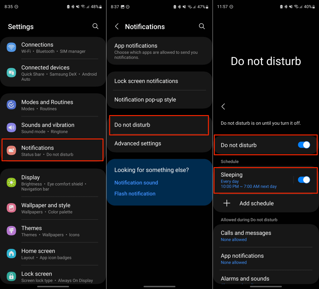 Στα τηλέφωνα ή τα tablet της Samsung, μπορείτε να απενεργοποιήσετε μην ενοχλείτε από το κέντρο ειδοποιήσεων, τον πίνακα γρήγορων ρυθμίσεων, τις ρυθμίσεις του συστήματος ή τη χρήση του Bixby.