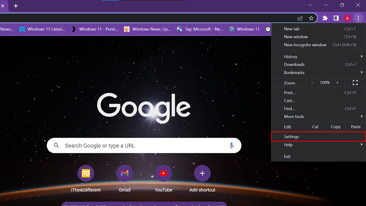 - ΑνοιχτόGoogle Chrome> Κάντε κλικ στομενού τριών σημείωνεικονίδιο στην επάνω δεξιά γωνία> Επιλέξτε τοΡυθμίσειςεπιλογή.