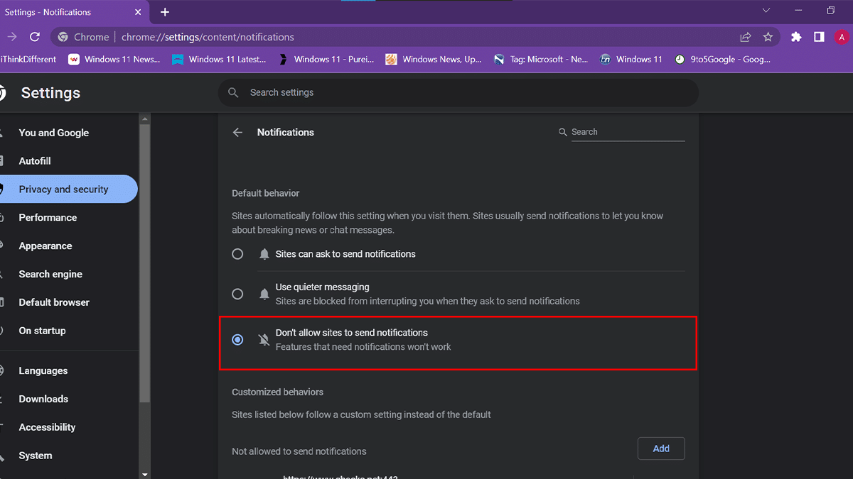- ΥπόΠροεπιλεγμένη συμπεριφορά> Επιλέξτε τοΜην επιτρέπετε στους ιστότοπους να στέλνουν ειδοποιήσειςεπιλογή.