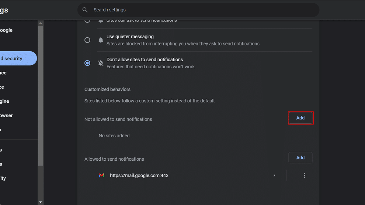 - Κάτω από το "Δεν επιτρέπεται να στείλει ειδοποιήσεις"> Κάντε κλικ στοΠροσθέτωκουμπί.