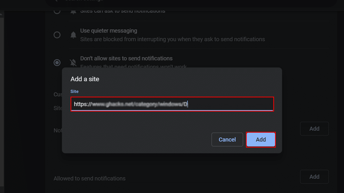 - Εισαγάγετε τοUrlτου ιστότοπου για τον οποίο θέλετε να απενεργοποιήσετε τις ειδοποιήσεις> Κάντε κλικ στοΠροσθέτω.