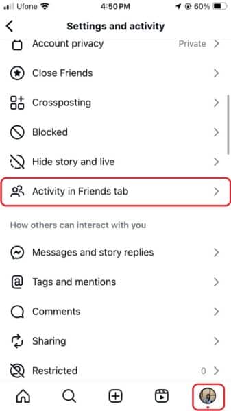 - Τώρα, πατήστε στοΔραστηριότητα στην καρτέλα Φίλοι. Αυτό είναι όπου ελέγχετε ποιος μπορεί να δείτε τα συμπαθήματα και τα σχόλιά σας στην καρτέλα Friends.