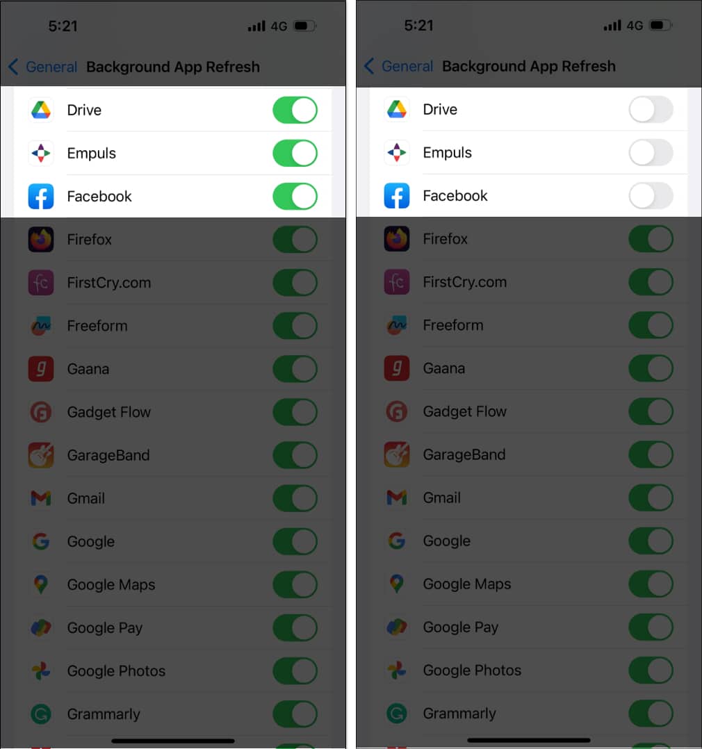 Στο iPhone σας, η λειτουργία ανανέωσης της εφαρμογής φόντου μπορεί να απενεργοποιηθεί λόγω της ενεργοποίησης της λειτουργίας χαμηλής ισχύος. Ή το έχετε απενεργοποιήσει για όλες τις εφαρμογές. Ελέγξτε εάν η εναλλαγή δίπλα στην εφαρμογή είναι ενεργοποιημένη. Εκτός αυτού, εάν έχετε κλείσει οποιαδήποτε εφαρμογή από το Switcher App, η δραστηριότητα φόντου θα σταματήσει.