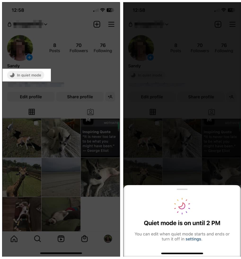 Όταν επιστρέφετε στο προφίλ σας Instagram, θα δείτεΣε ήσυχη λειτουργίαΚάτω από το όνομά σας με ένα εικονίδιο φεγγαριού. Μπορείτε να πατήσετεΣε ήσυχη λειτουργίαΓια να δείτε πόσο καιρό είναι ενεργοποιημένη εάν χρειάζεται.