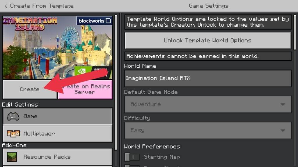 - Μετά την ολοκλήρωση της λήψης, επιλέξτεΔημιουργήστε αυτόν τον κόσμο!Τότε, επιλέξτεΔημιουργώήΔημιουργία σε διακομιστή RealmsΕάν θέλετε να κάνετε μια ηλεκτρονική συνεδρία.