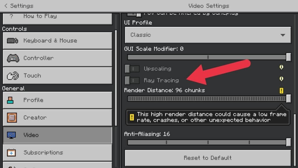 Εάν το παιχνίδι εξακολουθεί να μοιάζει με κανονικό Minecraft, επιστρέψτε στο κύριο μενού. Στη συνέχεια, επιλέξτεΡυθμίσεις>Βίντεοκαι εναλλαγή τουΔιακόπτης ανίχνευσης ακτίνωνστη θέση ON. Η οθόνη σας μπορεί να αναβοσβήνει εν συντομία καθώς ο κόσμος του παιχνιδιού επανεμφανίζεται.