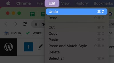 Γνωρίζουμε ότι οι συντομεύσεις πληκτρολογίου δεν είναι για όλους! Ως εκ τούτου, το macOS σάς επιτρέπει να ανατρέψετε τις αλλαγές μέσω της επιλογής Menubar. Μπορείτε να χρησιμοποιήσετε την επιλογή Undo χωρίς να βγείτε από την εφαρμογή.