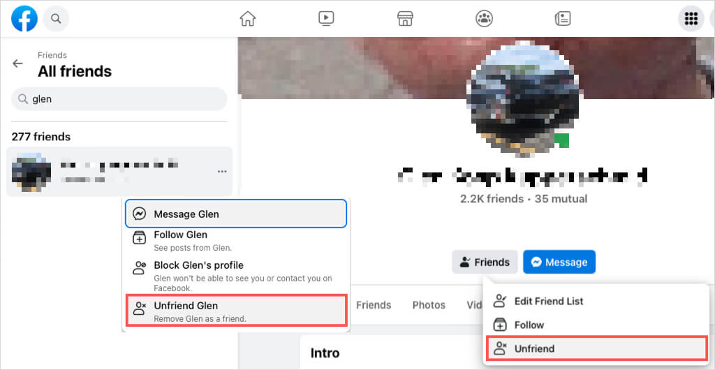 - Πατήστε τοτρεις τελείεςστα δεξιά του ονόματος του ατόμου και επιλέξτεUnfriend [Όνομα]Στο αναδυόμενο μενού.