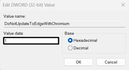 7.Μόλις δημιουργηθεί το κλειδί DonotUpDateToEdgeWithChromium, δημιουργήθηκε,κάντε διπλό κλικσε αυτό για να ανοίξει τις ιδιότητές του και να προσθέσετε1στοΑξία αξίαςπεδίο.