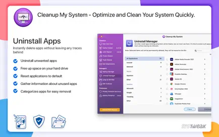 Οι χρήστες μπορούν να καταργήσουν περιττές εφαρμογές και συναφή αρχεία χρησιμοποιώντας τον καθαρισμό του συστήματός μου χωρίς να αφήσουν πίσω τους οποιοδήποτε είδος δεδομένων. Αυτό διατηρεί τη βελτιστοποίηση του MAC, ενισχύοντας ταυτόχρονα την απόδοση MAC. Όταν ξεκινάτε την ενότητα "Uninstall Manager", λαμβάνετε μια λίστα με τις διαθέσιμες εφαρμογές στο Mac σας. Βρείτε τις εφαρμογές που δεν χρησιμοποιείτε ή δεν γνωρίζετε και στη συνέχεια απεγκαταστήστε τις.