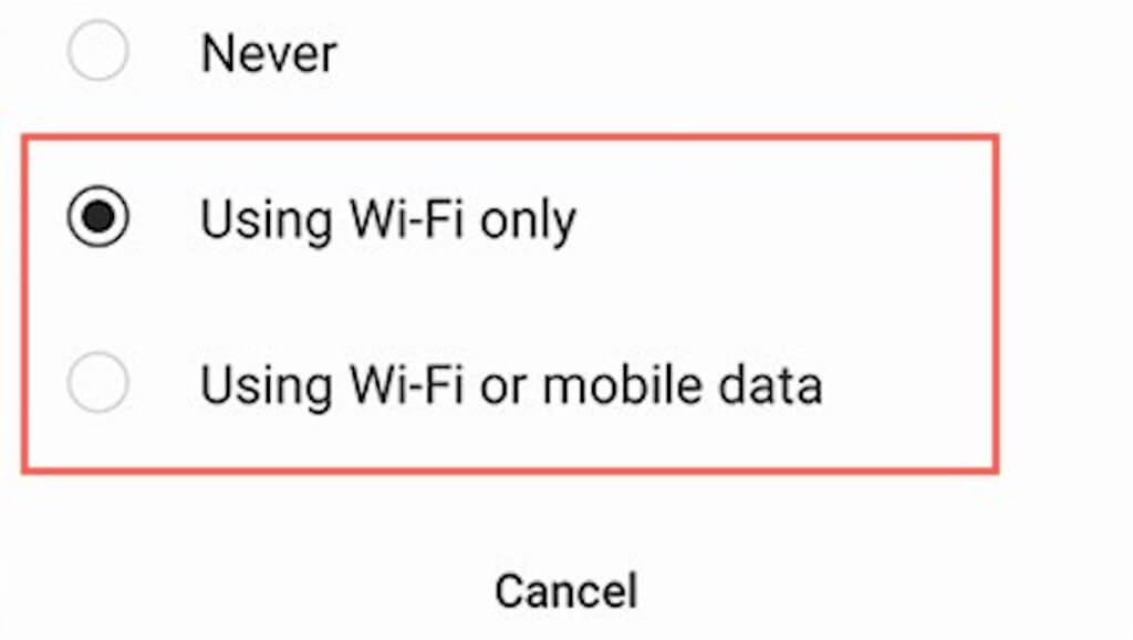 4. ΕπιλέξτεΠάνω από οποιοδήποτε δίκτυοήΠάνω από Wi-Fi μόνο. Επιλέξτε την τελευταία επιλογή εάν δεν θέλετε να αποφύγετε την υπερβολική χρήση κυτταρικών δεδομένων.