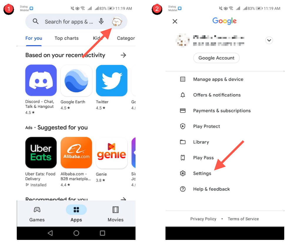 1. Πατήστε το εικονίδιο του προφίλ σας στην επάνω δεξιά πλευρά του Google Play Store και επιλέξτεΡυθμίσεις.