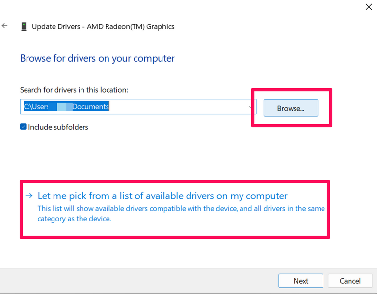Περιηγηθείτε στον υπολογιστή μου για οδηγούς- οΠεριηγηθείτε στον υπολογιστή μου για οδηγούςΗ επιλογή είναι για όσους θέλουν να ενημερώσουν τους οδηγούς τους με μη αυτόματο τρόπο στα Windows 11.