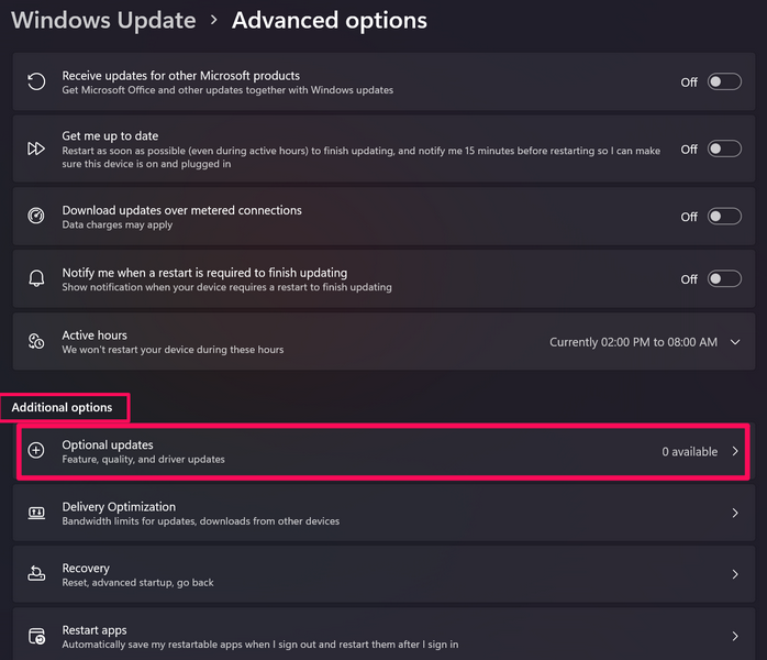 Εκτός από τη χρήση του διαχειριστή συσκευών για να ενημερώσετε τους οδηγούς στα Windows 11, μπορείτε επίσης να μεταβείτε στην ενημέρωση Windows Update εντός της εφαρμογής ρυθμίσεων στον υπολογιστή σας ή στο φορητό υπολογιστή σας για να ενημερώσετε τους οδηγούς σας. Βλέπετε, η λειτουργικότητα Update Windows διατηρεί την απεγκατάσταση ενημερώσεων προγράμματος οδήγησης κάτω από την προαιρετική ενότητα Ενημέρωσης από όπου μπορείτε να τις εγκαταστήσετε στη συσκευή σας Windows 11.