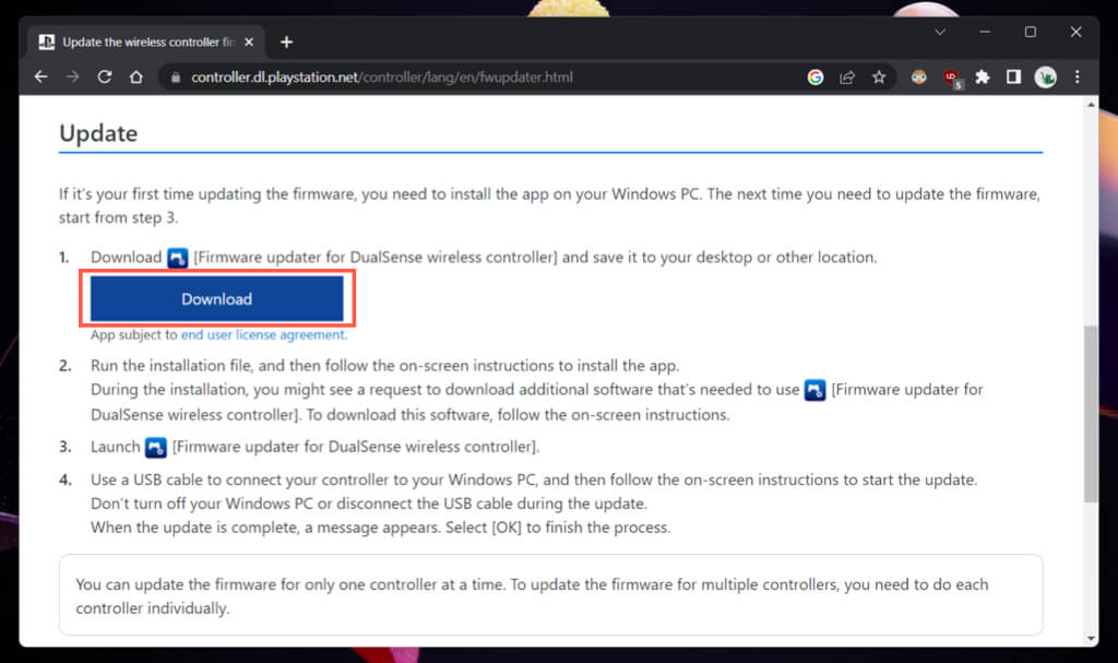 - Λήψη "Updater firmware για ασύρματο ελεγκτή DualSense"Από την επίσημη ιστοσελίδα του PlayStation.
