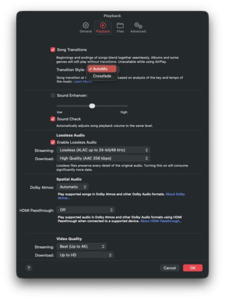 - AutoMixΑναμειγνύεται δυναμικά κομμάτια συνδρομής της Apple Music με έξυπνες μεταβάσεις. Μπορεί να παραλείψει τις μεταβάσεις για άλμπουμ που παίζονται σε σειρά, τραγούδια με κακοήθεις tempos, ή μεταφορτώσεις που δεν ταιριάζουν στον κατάλογο της Apple.