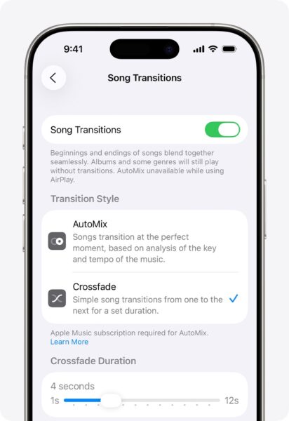 Πριν το ενεργοποιήσετε, είναι σημαντικό να κατανοήσετε πού υποστηρίζεται η Automix και πώς διαφέρει από το Crossfade. Το Automix απαιτεί μια συνδρομή Apple Music και λειτουργεί μόνο σε iPhone, iPad, Apple Vision Pro και Mac Apple Silicon. Το Crossfade είναι ευρύτερα διαθέσιμο, συμπεριλαμβανομένων των μη συνδρομητών, αλλά είναι προβλέψιμο και δεν προσαρμόζεται στη μουσική.