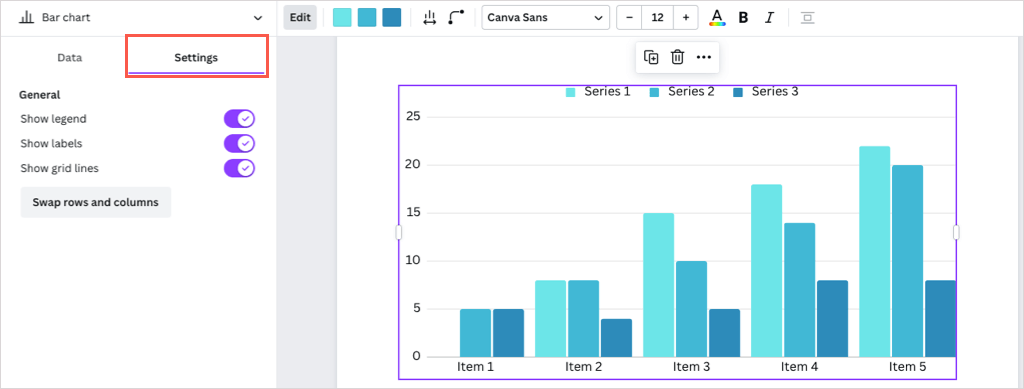 - Επιλέξτε το γράφημα και χρησιμοποιήστε τοΔεδομένακαρτέλα στην πλαϊνή μπάρα για να αντικαταστήσετε τα δεδομένα δείγματος με τη δική σας. Μπορείτε επίσης να επεκταθείτεΠροσθέστε δεδομέναΣτο κάτω μέρος για να ανεβάσετε ένα αρχείο CSV ή να εισαγάγετε ένα γράφημα από τα φύλλα Google.