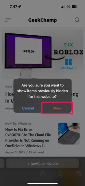 Τώρα, αφού χρησιμοποιήσετε τον έλεγχο της απόσπασης της προσοχής για να αποκρύψετε στοιχεία ιστοσελίδας στο Safari, μπορείτε να τα επαναφέρετε ενόψει της ιστοσελίδας. Ακολουθήστε τα βήματα παρακάτω για να το κάνετε αυτό:
