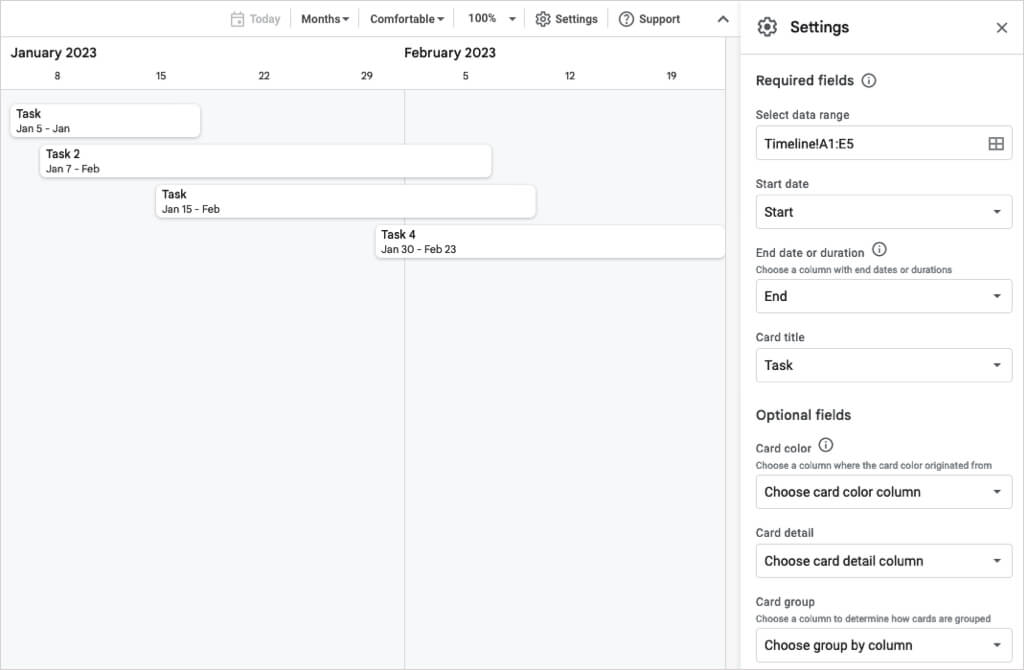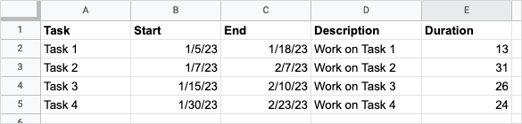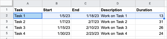 Εάν βρίσκεστε στη μέση του σχεδιασμού του έργου, η προβολή χρονοδιαγράμματος στο Google Sheets μπορεί να σας βοηθήσει να μείνετε σε καλό δρόμο. Πάρτε τα δεδομένα του έργου σας και ανοίξτε τα σε ένα απλό χρονοδιάγραμμα που περιλαμβάνει κάρτες για εργασίες με ημερομηνίες λήξης και διάρκειες.