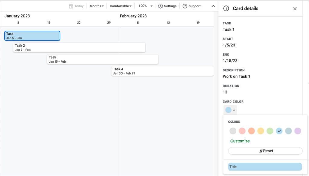 Μπορείτε να συμπεριλάβετε περιγραφές εργασιών και χρωματική κωδικοποίηση. Στη συνέχεια, δείτε το χρονοδιάγραμμά σας ανά εβδομάδα, μήνα, τρίμηνο ή έτος για την καλύτερη εικόνα. Δείτε πώς μπορείτε να ρυθμίσετε και να χρησιμοποιήσετε το χρονοδιάγραμμα του έργου Google Sheets.