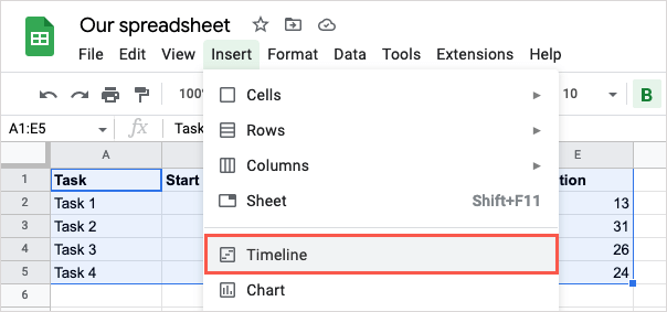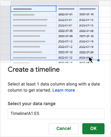 - Επιλέξτε τα δεδομένα που θέλετε να χρησιμοποιήσετε για το χρονοδιάγραμμα, συμπεριλαμβανομένων των κεφαλίδων για τις παραπάνω στήλες.