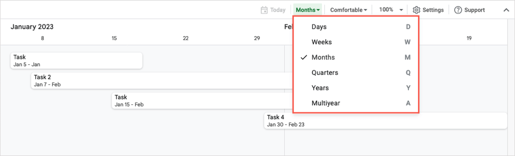 Όπως αναφέρθηκε, μπορείτε να δείτε το χρονοδιάγραμμά σας με διάφορα χρονικά πλαίσια. Στην κορυφή, χρησιμοποιήστε το αναπτυσσόμενο μενού για να επιλέξετε από ημέρες, εβδομάδες, μήνες, τετράγωνα ή χρόνια.