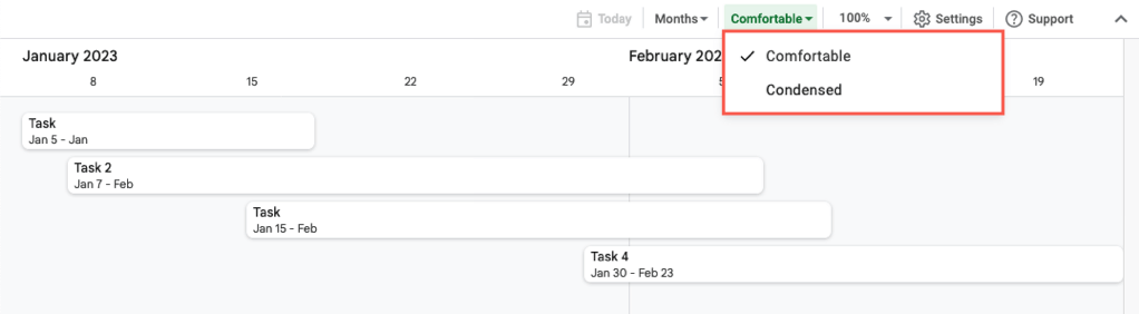 Στα δεξιά, χρησιμοποιήστε τα επόμενα αναπτυσσόμενα κουτιά για να επιλέξετε ανάμεσα σε μια άνετη ή συμπυκνωμένη προβολή ή ζουμ στο χρονοδιάγραμμα.