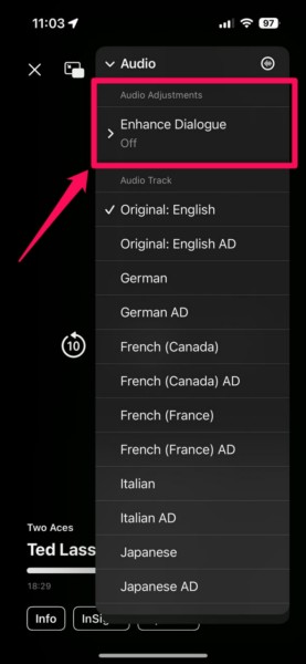 Το χαρακτηριστικό διαλόγου Enhance μειώνει ουσιαστικά τον όγκο της μουσικής υπόκρουσης και αυξάνει τον όγκο του λόγου σε μια σκηνή για να αφήσει τους θεατές να ακούσουν τους διαλόγους πιο καθαρά από ποτέ. Έτσι, οι χρήστες δεν θα βιώσουν πλέον βαθμολογίες φόντου για το αυτί να φουσκώνουν τους διάλογους των ηθοποιών σε μια σκηνή, απολαμβάνοντας την αγαπημένη τους ταινία ή τηλεοπτική εκπομπή στην εφαρμογή Apple TV στο iPhone.