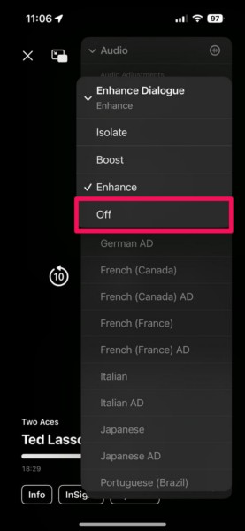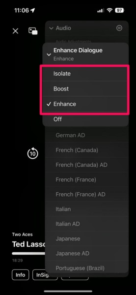 Τώρα, το δεύτερο νέο χαρακτηριστικό εντός της εφαρμογής της Apple TV στο iPhone έχει ως στόχο τη βελτίωση της εμπειρίας ήχου για τους χρήστες. Μεταγλωττισμένη βελτίωση του διαλόγου, το χαρακτηριστικό λειτουργεί όπως διατίθεται στο εμπόριο, καθιστώντας τους διαλόγους ταινιών και τηλεοπτικών εκπομπών πιο ακουστικών στην εφαρμογή της Apple TV.