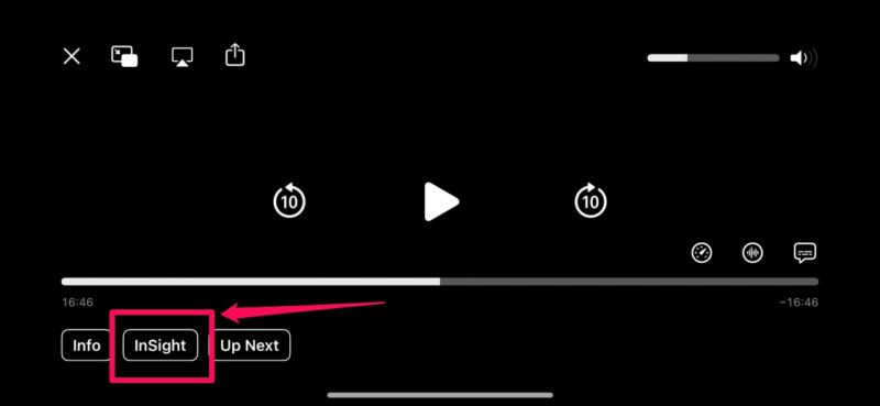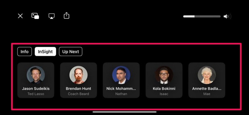 Η λειτουργία Insight είναι παρόμοια με τη λειτουργία ακτίνων Χ του Prime Video και λειτουργεί με τον ίδιο τρόπο. Ωστόσο, σε αντίθεση με τη λειτουργία ακτίνων Χ μέσα στην εφαρμογή Prime Video που όχι μόνο δείχνει τα ονόματα των ηθοποιών στην οθόνη, αλλά παρέχει επίσης γενικά γεγονότα και διασκέδαση για το περιεχόμενο, η Insight της Apple δείχνει μόνο τα ονόματα των ηθοποιών και των ηθοποιών και τίποτα περισσότερο.
