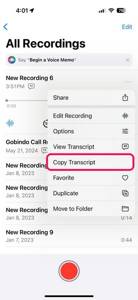 4.Εκτός από αυτό, μπορείτε επίσηςΑντιγράψτε ολόκληρη τη μεταγραφή ήχουτης εγγραφής χρησιμοποιώντας τοΕπιλογή μεταγραφής αντιγραφήςστο μενού περιβάλλοντος.