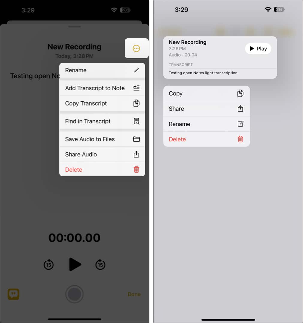 Από εδώ, πατήστεΠερισσότερο(εικονίδιο τριών σημείων) για να προσθέσετε το αντίγραφο στη σημείωση ή να το αντιγράψετε για χρήση αλλού. Μπορείτε επίσης να μοιραστείτε το αρχείο ήχου ή να το αποθηκεύσετε στα αρχεία iCloud. Εάν δεν το χρειάζεστε πλέον, μπορείτε να το διαγράψετε επίσης.