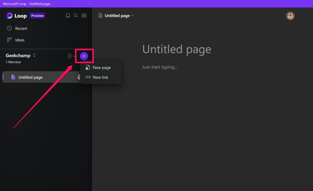 1.Ο νέος σας χώρος εργασίας θα περιέχει μια κενή σελίδα χωρίς τίτλο. Εκτός από την προσθήκη στοιχείων βρόχου, μια εικόνα κάλυψης και ένα emoji στον τίτλο της κενής σελίδας, μπορείτε να κάνετε κλικ στο+κουμπί στην πλαϊνή ράβδο για να προσθέσετε σελίδες στο χώρο εργασίας σας. Μπορείτε να κάνετε κλικ στοΝέα σελίδαεπιλογή για να λάβετε μια νέα κενή σελίδα ή να χρησιμοποιήσετε τοΝέος σύνδεσμοςΕπιλογή για να μεταφερθείτε μια υπάρχουσα σελίδα βρόχου στον χώρο εργασίας σας χρησιμοποιώντας τον κοινόχρηστο σύνδεσμό της.
