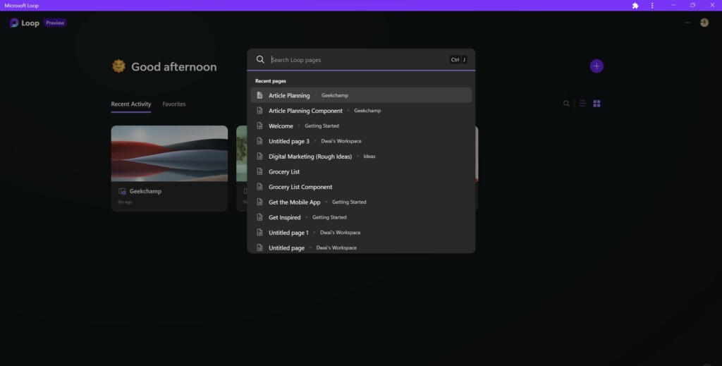 Τώρα, όταν ανοίγετε το εργαλείο καθολικής αναζήτησης σε βρόχο, θα σας παρουσιαστεί μια μακρά λίστα με τις πρόσφατες σελίδες και τους χώρους εργασίας που επισκεφθήκατε. Μπορείτε να επιλέξετε την επιθυμητή τοποθεσία σας από τη λίστα για να μεταβείτε σε αυτήν αμέσως ή να πληκτρολογήσετε στο όνομα της σελίδας ή του χώρου εργασίας που θέλετε να βρείτε στο βρόχο.