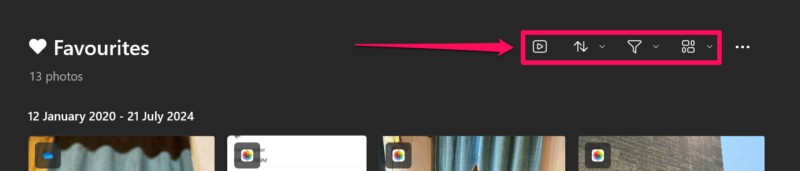 6.Μέσα στη συλλογή αγαπημένων, μπορείτε επίσης να V vIEW όλες τις εικόνες ως παρουσίαση,Χρησιμοποιήστε επιλογές διαλογής και φιλτραρίσματος,Αλλάξτε την προβολή διάταξηςχρησιμοποιώντας τοΠάνω από κουμπιά μενού.