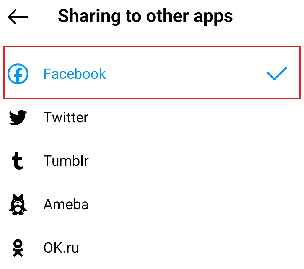 5. Θα υπάρχει ένας κατάλογος κοινωνικών πλατφορμών στις οποίες μπορεί να συνδεθεί το Instagram. Βρείτε το Facebook και ελέγξτε αν είναι μπλε και έχει ένα μπλε σημάδι επιλογής δίπλα του. Αυτό σημαίνει ότι οι λογαριασμοί συνδέονται.