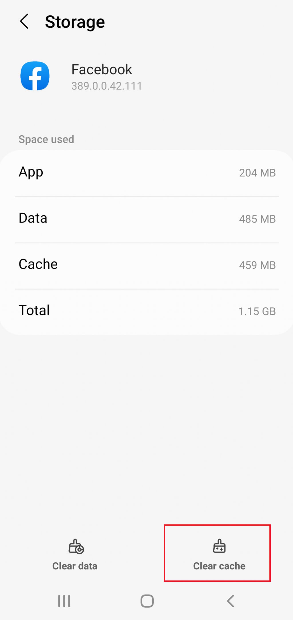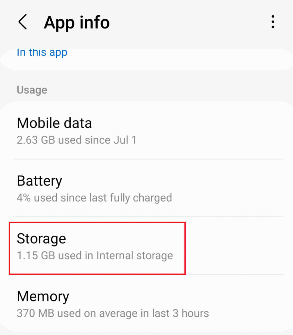 4. Άλλα μοντέλα Android Phones μπορεί να έχουνΑποθήκευσηΤμήμα στην εφαρμογή. Όταν μπαίνειςΑποθήκευσηΘα σας δοθούν δύο επιλογές:Καθαρίστε τα δεδομέναήΚαθαρή κρυφή μνήμη. Πατήστε τη δεύτερη επιλογή.