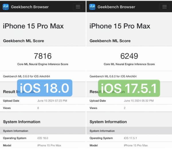 Οι βαθμολογίες Geekbench, παρακολούθησαν σχολαστικάΠνοή, αποκαλύπτουν ότι ενώ το iOS 17.5.1 έδωσε τυπικά τις βαθμολογίες συμπερασμάτων νευρωνικών κινητήρων ML στο χαμηλό 6000 για το iPhone 15 Pro Max, το iOS 18 έχει ωθήσει αυτές τις βαθμολογίες σε 7816.
