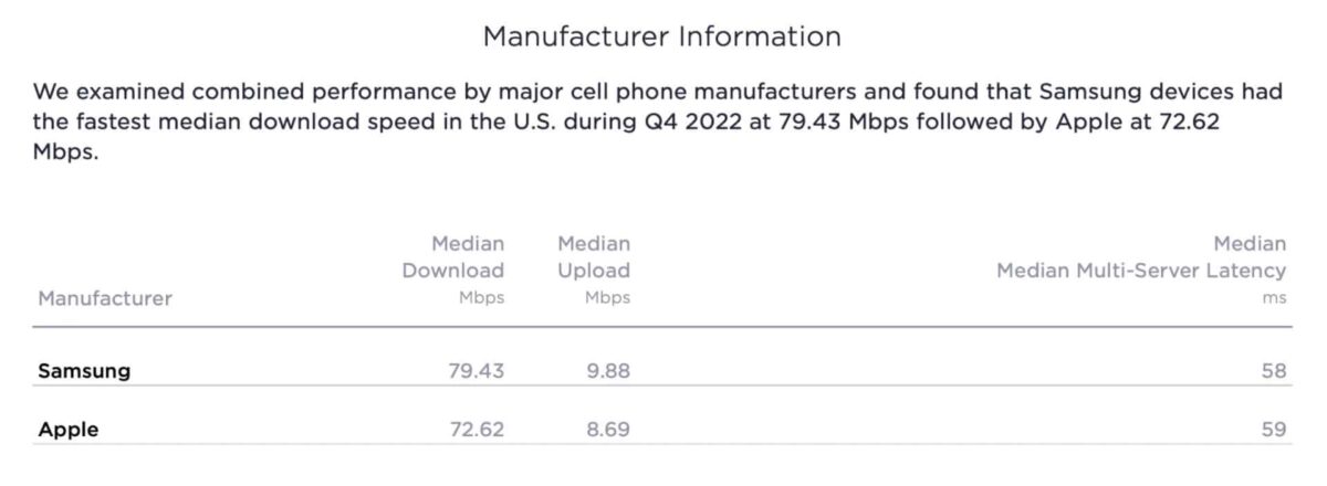 Άλλα αποτελέσματα των δοκιμών δείχνουν ότι τα smartphones της Samsung λαμβάνουν το συνολικό προβάδισμα για "ταχύτερες μέσες ταχύτητες λήψης σε σύγκριση με όλα τα iPhones κατά περίπου 7 Mbps".