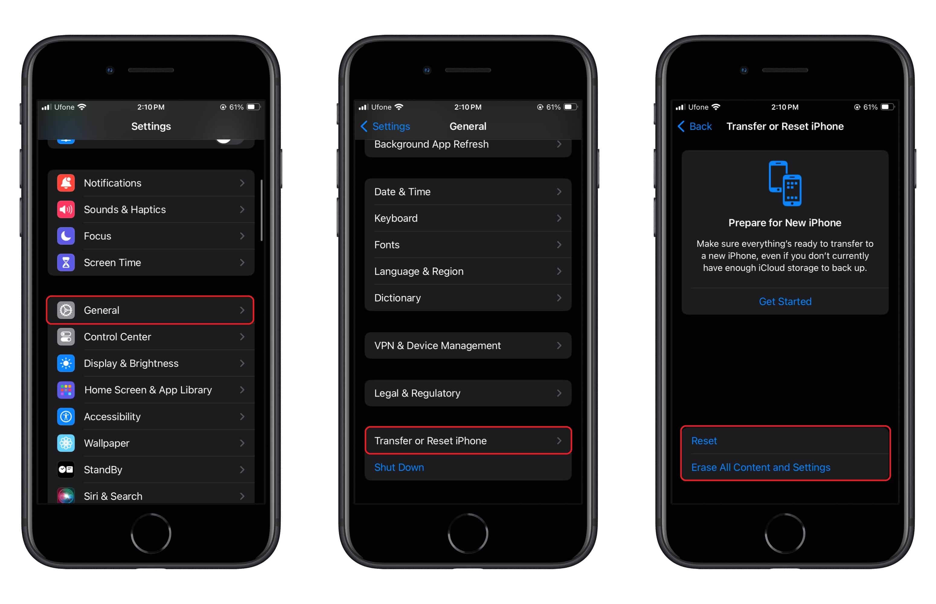 - ΠηγαίνωΓενικός>Επαναφορά>Διαγράψτε όλο το περιεχόμενο και τις ρυθμίσεις. Μετά την επαναφορά, μπορείτε να επαναφέρετε τα δεδομένα σας από το αντίγραφο ασφαλείας που δημιουργήσατε.