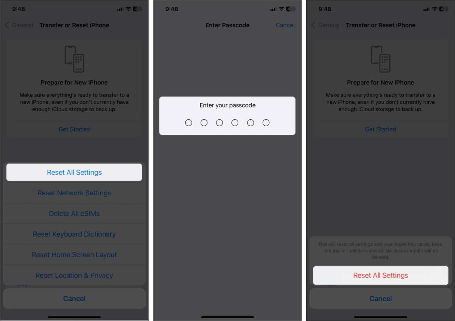 Για να επαναφέρετε τις ρυθμίσεις του iPhone σας, ανοίξτεΡυθμίσεις. Τότε, πηγαίνετε στοΓενικός→Μεταφορά ή επαναφορά του iPhone→Επαναφορά→Επαναφέρετε όλες τις ρυθμίσεις. Τώρα, εισαγάγετε τον κωδικό πρόσβασης iPhone και πατήστεΕπαναφέρετε όλες τις ρυθμίσειςΓια να επιβεβαιώσετε την επιλογή σας.