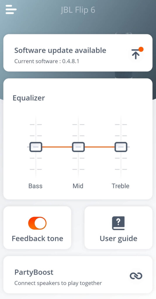 Η εφαρμογή είναι απλή και φιλική προς το χρήστη, όπως και ο ίδιος ο ομιλητής. ΣτοΕξισωτής, μπορείτε να τσίμπημαΜπάσσο,Στα μέσα,Τριπλάσιος. Μπορείτε επίσης να χρησιμοποιήσετε την εφαρμογή για να αλλάξετε το όνομα του Flip 6 σε ένα προσαρμοσμένο.