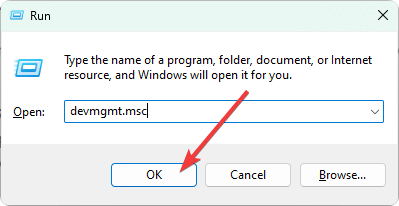 - Πατήστε Win + R για να ανοίξετε το Run, πληκτρολογήστε devmgmt.msc και κάντε κλικ στο OK για να ανοίξετε τη διαχείριση συσκευών.