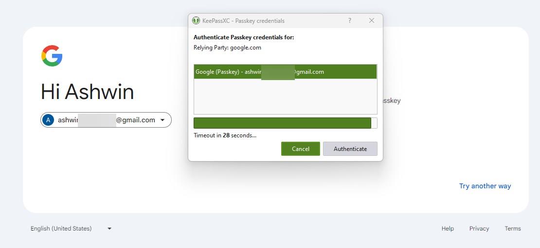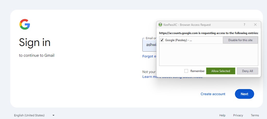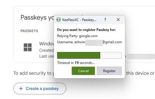 Προκειμένου να το χρησιμοποιήσετε, θα χρειαστεί επίσης να "ενεργοποιήσετε τα passkeys" στις ρυθμίσεις της επέκτασης. Για να αποκτήσετε πρόσβαση στα αποθηκευμένα κλινικά στην εφαρμογή, κατευθυνθείτε προς τη βάση δεδομένων> Passkeys. Μεταβείτε σε έναν ιστότοπο που υποστηρίζει το Passkeys, για παράδειγμα,Google. Επιλέξτε την επιλογή "Δημιουργήστε μια επιλογή passkey" και επιλέξτε "Χρησιμοποιήστε άλλη συσκευή". Θα πρέπει να δείτε ένα αναδυόμενο παράθυρο από την επέκταση του προγράμματος περιήγησης KeepASSXC που σας ζητά να αποθηκεύσετε το κλειδί, κάντε κλικ στο "Εγγραφή".