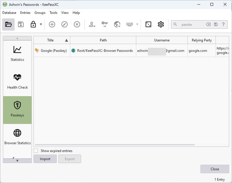 Η εφαρμογή διαχείρισης κωδικών πρόσβασης σας επιτρέπει επίσης να εισάγετε υπάρχοντα passkeys που είναι αποθηκευμένα στον υπολογιστή σας (αρχεία .passkey). Μόλις αποθηκεύσετε ένα κλειδί στο KeepASSXC, θα μπορείτε να συνδεθείτε σε ιστότοπους χωρίς να χρησιμοποιήσετε έναν κωδικό πρόσβασης.