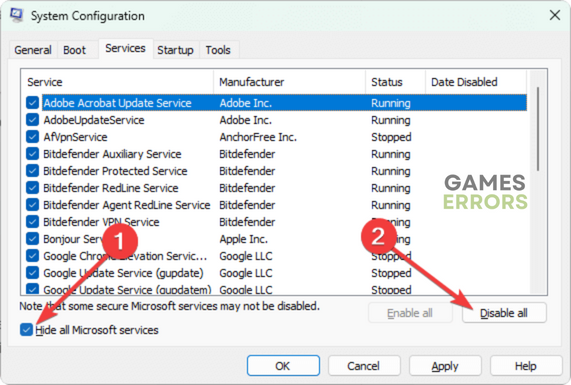- Σημειώστε το κουτί δίπλα στοΑπόκρυψη όλων των υπηρεσιών της Microsoftκαι μετά κάντε κλικ στο κουμπίΑπενεργοποιήστε όλα.