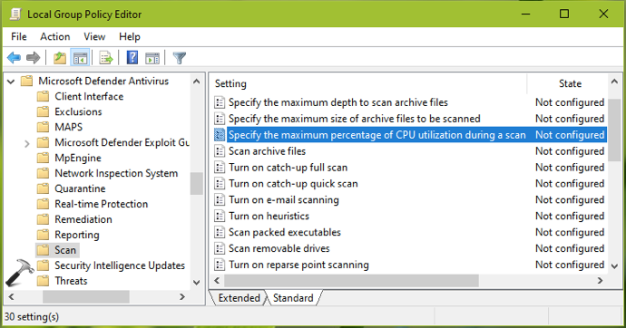 Set-MpPreference -ScanAvgCPULoadFactor XXΓια παράδειγμα, για να ορίσετε τη χρήση της CPU σε 30% κατά τη διάρκεια μιας σάρωσης των Windows Defender, θα εκτελέσωSet-MpPreference -ScanAvgCPULoadFactor 30εντολή.